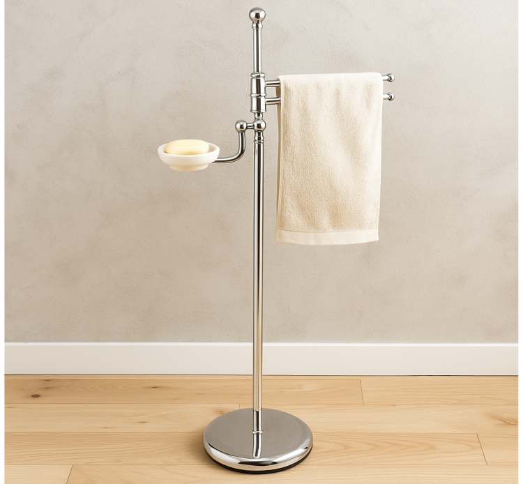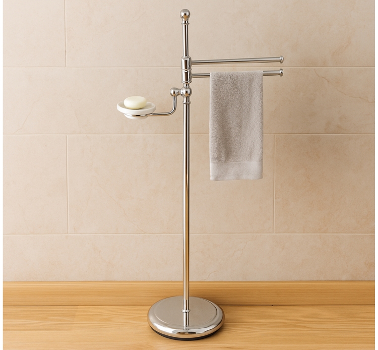 Debout près de la salle de bain, le style est classique et élégant, composé d'une barre à serviettes, deux baguettes et porte-savon en céramique blanche. Le métal utilisé pour la réalisation de ce produit est exclusivement laiton, métal précieux, capable de résister à l'usure, même dans des environnements humides. Les deux barres porte-serviettes et porte-savon sont libres de tourner sur l'arbre central de l'enrouleur afin d'assumer la meilleure forme dans chaque salle de bains.