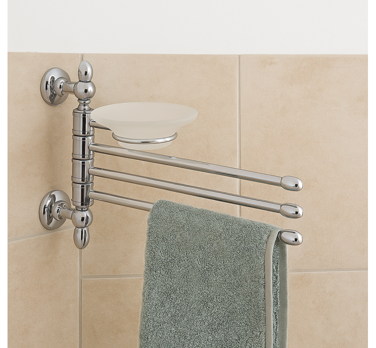 The porta salviette is totally anti-rust composed of three rolling rods for bidet wipes and a round soap plate in satin glass. All the elements rotate each other to adapt them to every need of space. The item is easily fixed to the wall with screws and dowels that guarantee the best possible stability.