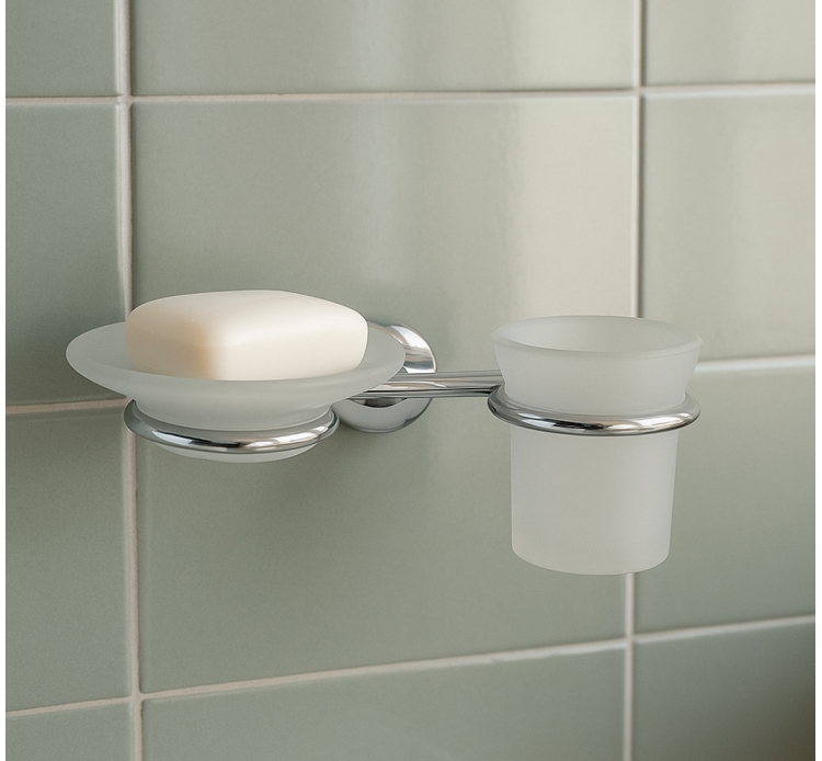 Accessorio due funzioni da bagno, porta sapone e bicchiere in vetro satinato da fissare alla parete